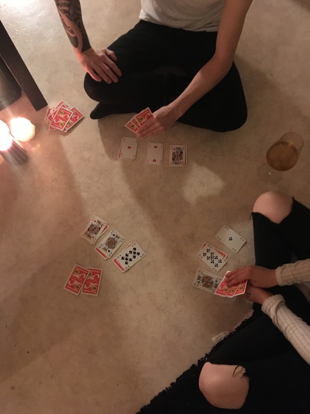 Vi sitter på golvet, som en cirkel som just ska offra. Men här offras ingenting. Nej, i våran cirkel finns bara sprit, kortspel och glada ansikten.